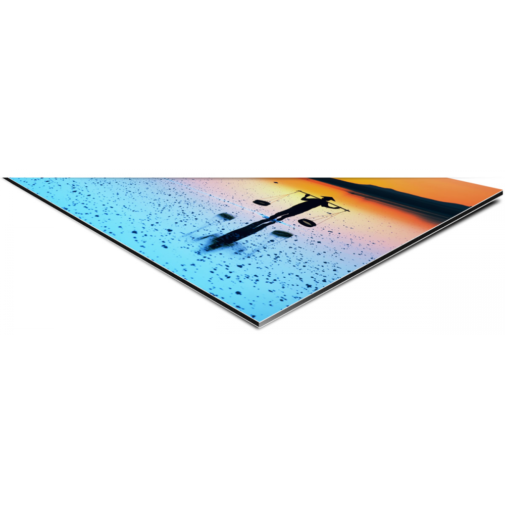 Panel de aluminio sandwich con núcleo de poliestireno negro de 3 mm de espesor y extremadamente rígido, es un material excelente para exteriores gracias a su resistencia, ya que soporta las dilataciones y contracciones provocadas por los cambios de temperatura entre el frío y el calor. Nuestro panel de aluminio composite Etalbond está compuesto por 2 láminas de aluminio exterior de 0,2 mm de espesor lacadas en blanco ( tipo sándwich ) y un núcleo central de macizo de Polietileno en color negro. El soporte garantiza una adherencia óptima de la tinta después de la impresión directa con tintas UVI. El panel composite de aluminio es ideal para aplicaciones al exterior de larga duración por su excelente resistencia al calor y al impacto. Las tintas UVI de impresión digital que se utilizan hoy en día para imprimir carteles con garantía al exterior, pueden aguantar a los rayos UVI hasta un máximo de 3 años en función del tiempo de exposición, orientación y ubicación con respecto al sol.